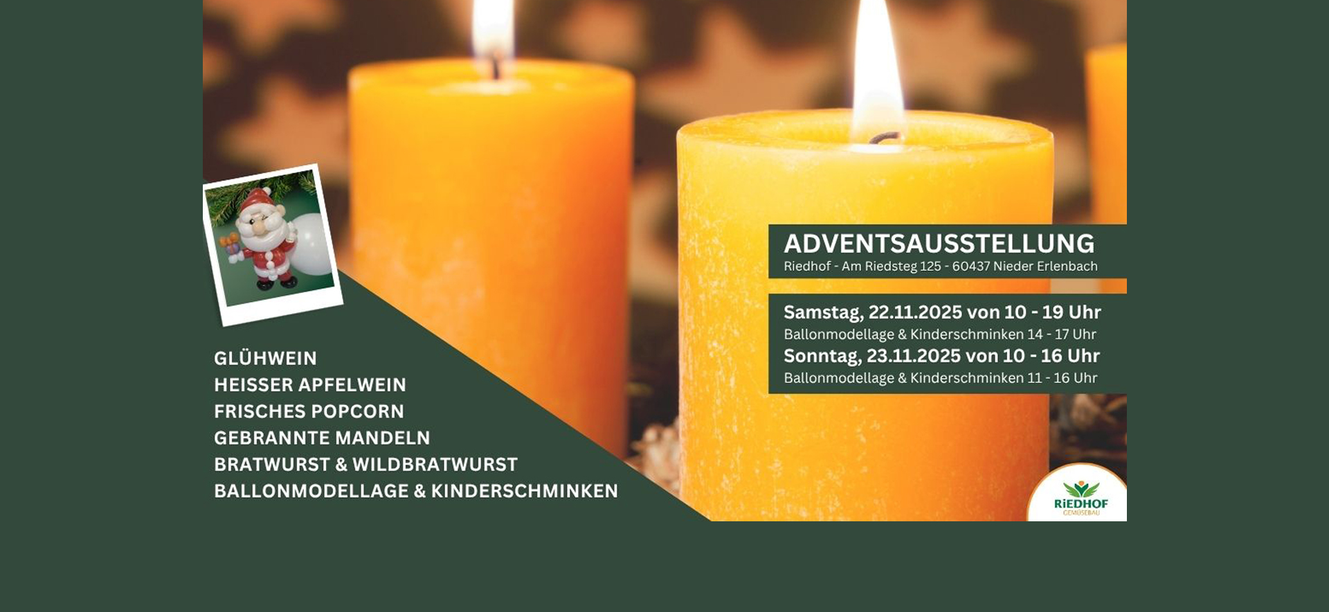 Am Samstag, dem 22. November 2025 von 10 bis 19 Uhr und am Sonntag, dem 23. November 2025 von 10 bis 16 Uhr findet wieder unsere stimmungsvolle Adventsausstellung statt, mit der wir euch auf die bevorstehende Weihnachtszeit einstimmen wollen. Neben liebevoll gestalteten Adventsgestecken, winterlichen Sträußen und weihnachtlichen Arrangements erwartet euch ein vielfältiges kulinarisches Angebot. Glühwein, heißer Apfelwein, gebrannte Mandeln, frisches Popcorn sowie Bratwurst und Wildbratwurst vom Grill sorgen für das leibliche Wohl. Auch für Kinder ist gesorgt: Kinderschminken und weihnachtliche Ballonmodellage bieten Spiel und Spaß für die kleinen Gäste. Wir laden eure Familien, Freunde und Nachbarn dazu ein, gemeinsam die Adventszeit einzuläuten und sich in gemütlicher Atmosphäre inspirieren zu lassen.